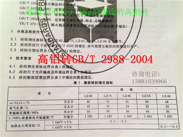 9.產品指標:本公司根據(jù)國標GB/T2988-2004生產川耐牌高鋁磚,其指標如下: